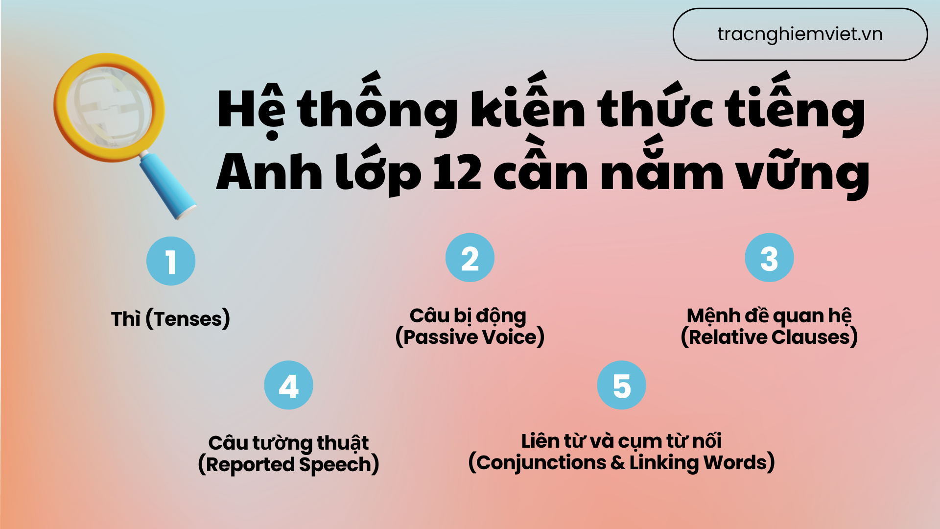 Trước khi bắt đầu luyện 50 bài tập, bạn cần nắm vững 5 nhóm kiến thức trọng tâm trong chương trình tiếng Anh lớp 12, vì đây là nền tảng xuyên suốt trong đề thi THPT Quốc gia.