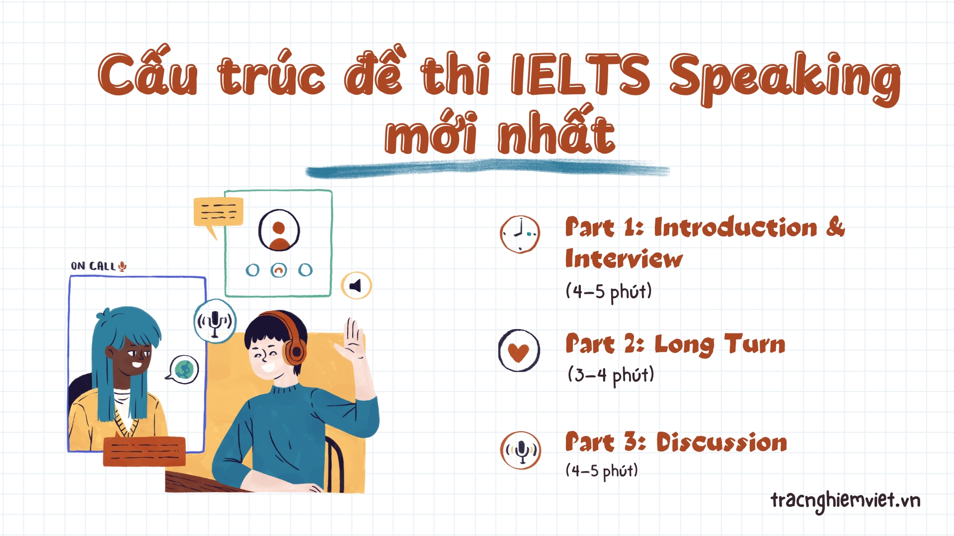Đề thi IELTS Speaking được tổ chức trong khoảng 11–14 phút, chia thành 3 phần chính. Dù ngắn nhưng áp lực khá lớn, bởi đây là phần duy nhất thí sinh phải tương tác trực tiếp với giám khảo.