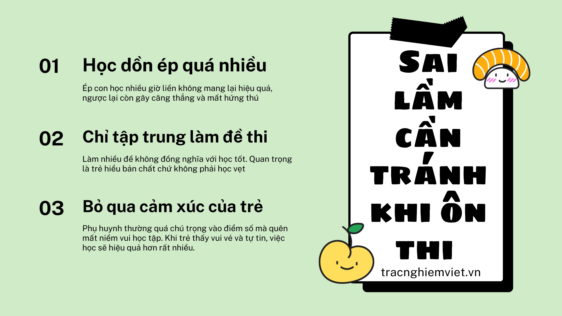 Ép trẻ học liên tục trong thời gian dài dễ khiến con mệt mỏi, căng thẳng và không còn hứng thú. Thay vì bắt học nhiều giờ liền, cha mẹ nên chia nhỏ thời gian học thành từng buổi ngắn, kết hợp nghỉ ngơi và chơi đùa để giúp trẻ tiếp thu hiệu quả hơn.