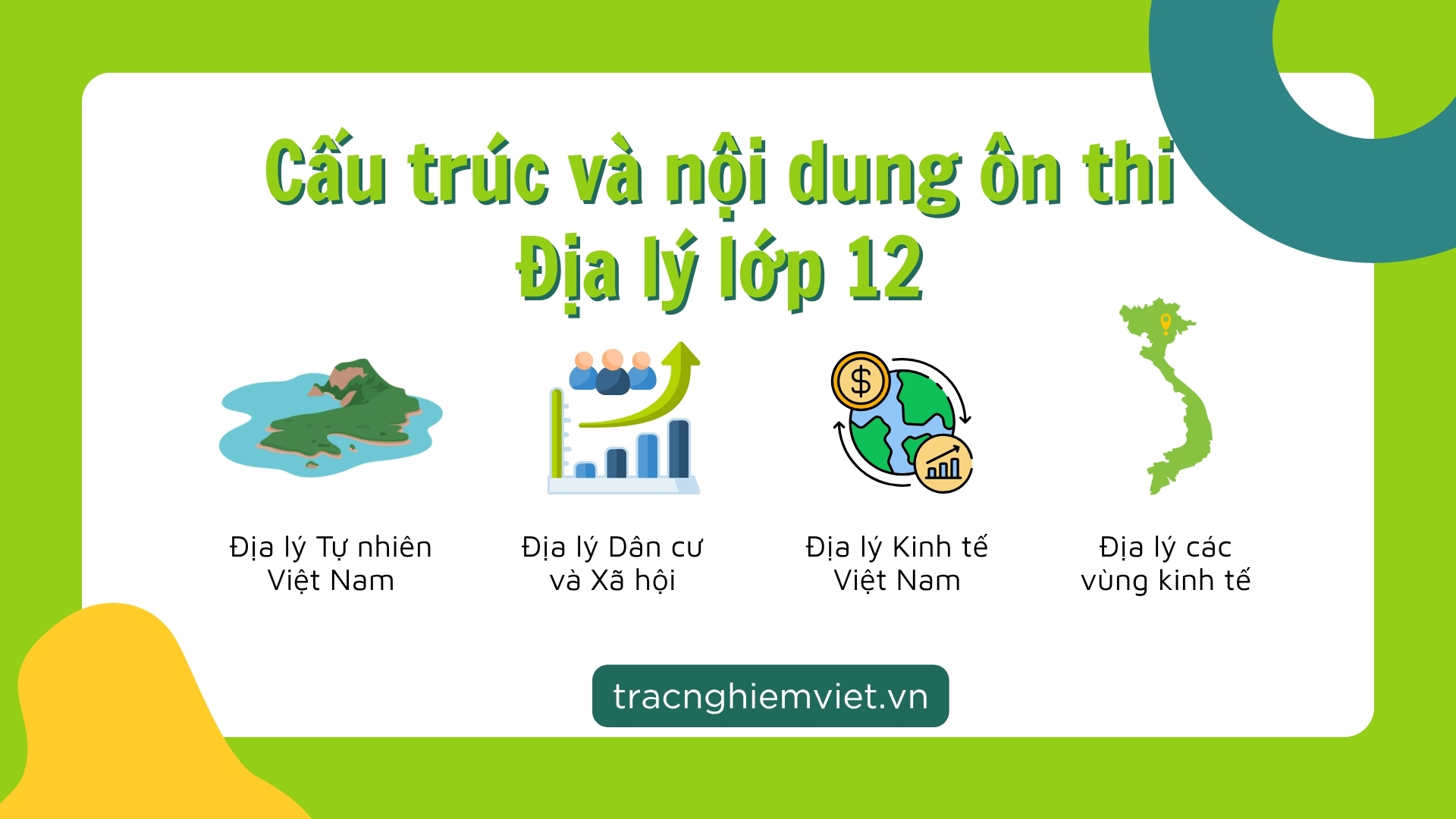 Theo chương trình GDPT, kiến thức Địa lý lớp 12 được chia thành 4 phần chính. Dưới đây là tổng quan cấu trúc và các chuyên đề trắc nghiệm trọng tâm.