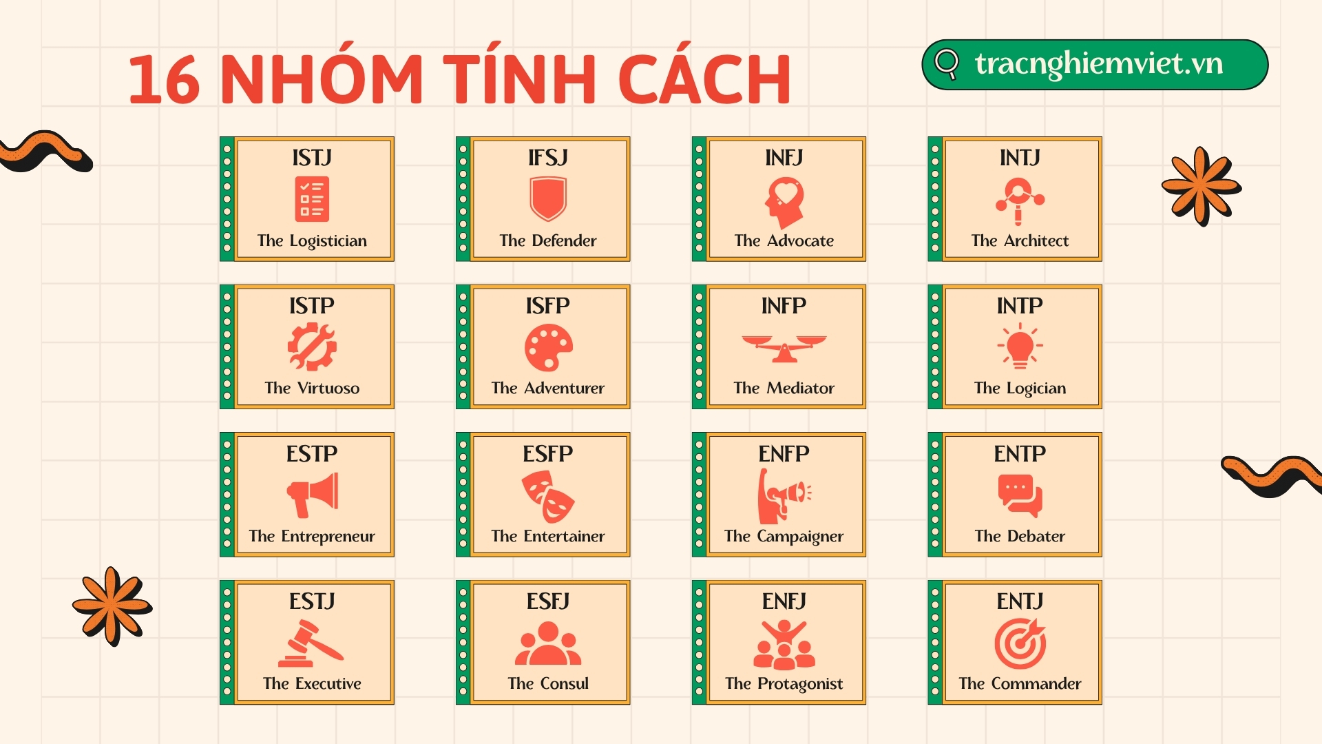 Kết hợp 4 cặp tạo nên 16 nhóm tính cách. Ví dụ: ENFP, ISTJ, ENTJ…