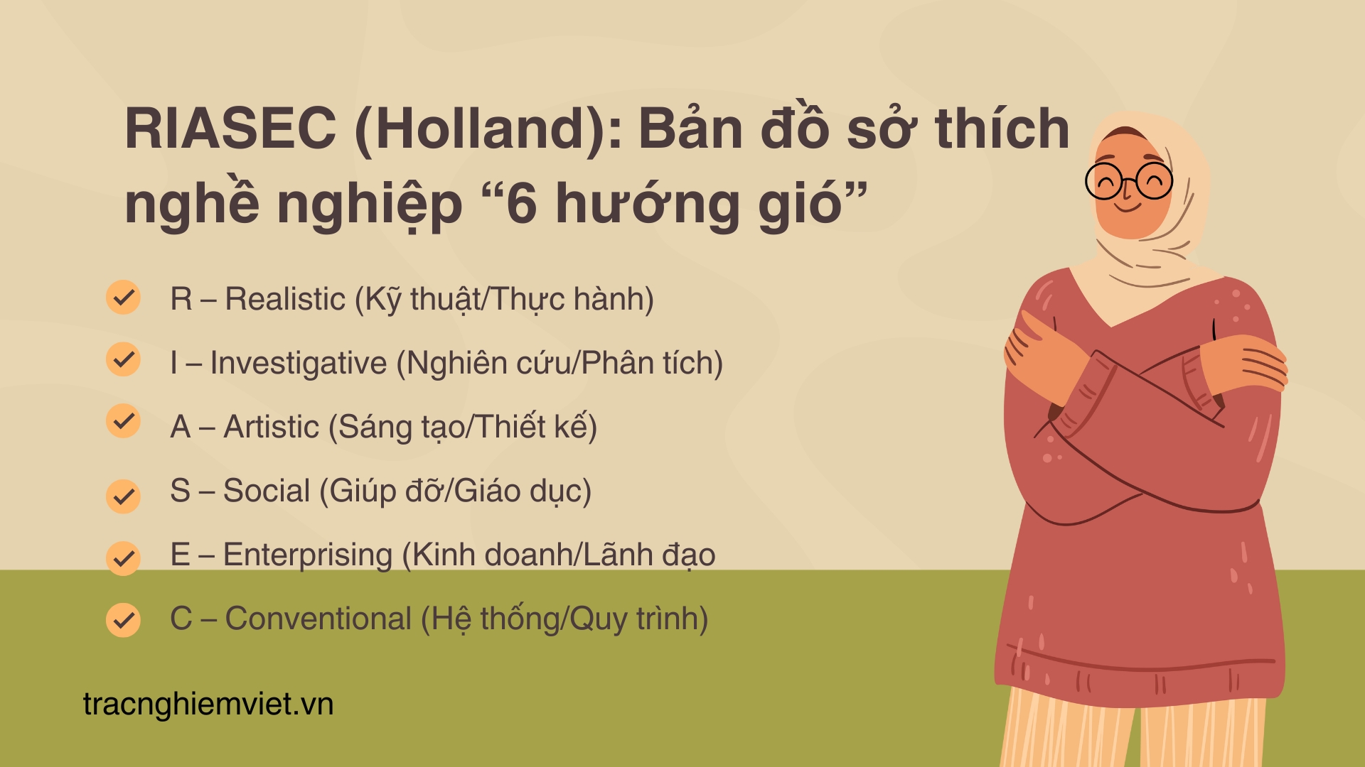 RIASEC (Holland): phân nhóm sở thích nghề thành 6 kiểu: Realistic, Investigative, Artistic, Social, Enterprising, Conventional.