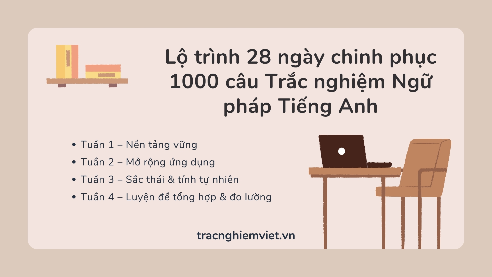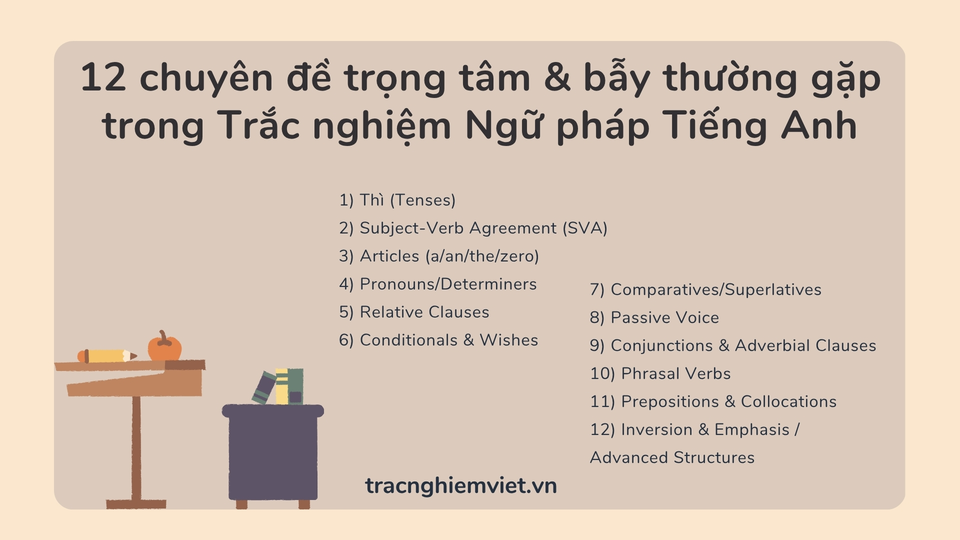 Gợi ý: Đặt mục tiêu 85–90% chính xác ở từng chuyên đề trước khi chuyển sang chuyên đề mới trong bộ Trắc nghiệm Ngữ pháp Tiếng Anh.