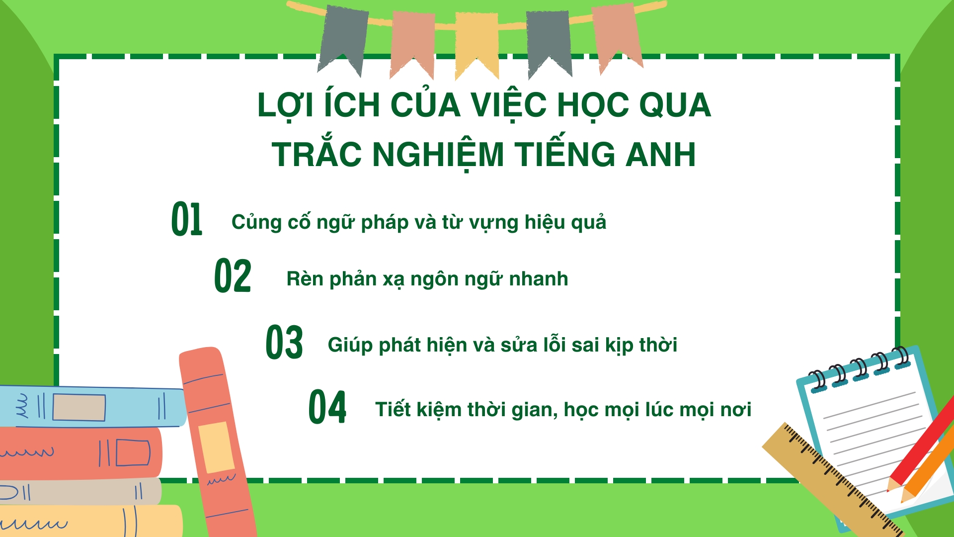 Làm trắc nghiệm thường xuyên giúp bạn quen với tốc độ xử lý thông tin, kỹ năng quan sát nhanh và chọn đáp án chính xác chỉ trong vài giây – yếu tố cực kỳ quan trọng trong các bài thi như TOEIC Listening hay IELTS Reading.